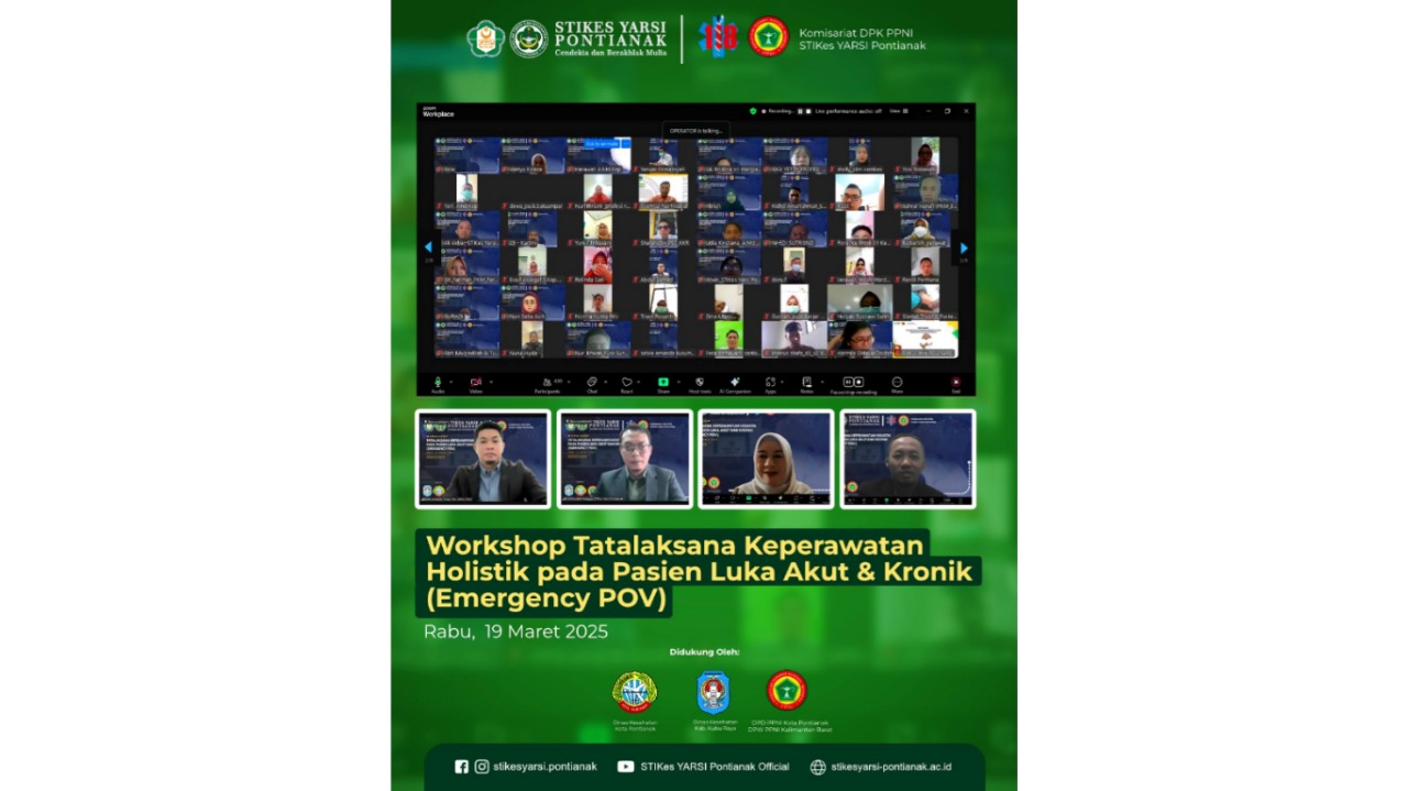 Pontianak, 19 Maret 2025 — STIKes YARSI Pontianak melalui Komesariat DPK PPNI kembali menunjukkan komitmennya dalam peningkatan kompetensi perawat dengan mengadakan Workshop Tatalaksana Keperawatan Holistik pada Pasien Luka Akut & Kronik (Emergency POV) secara daring melalui platform Zoom Meeting.