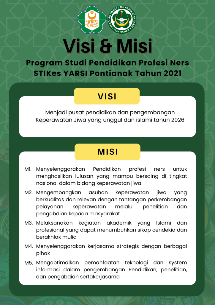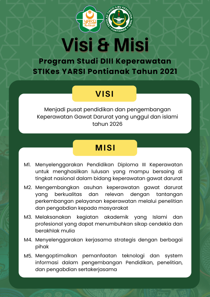 Stikes Yarsi Pontianak memiliki visi Menjadi Pusat Pendidikan Kesehatan yang Unggul dan Islami pada tahun 2035